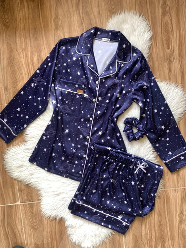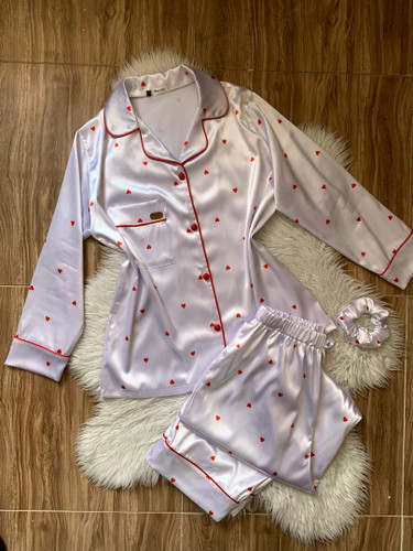 ست بلوز شلوار زنانه ساتن سورمه ای قلب سفید